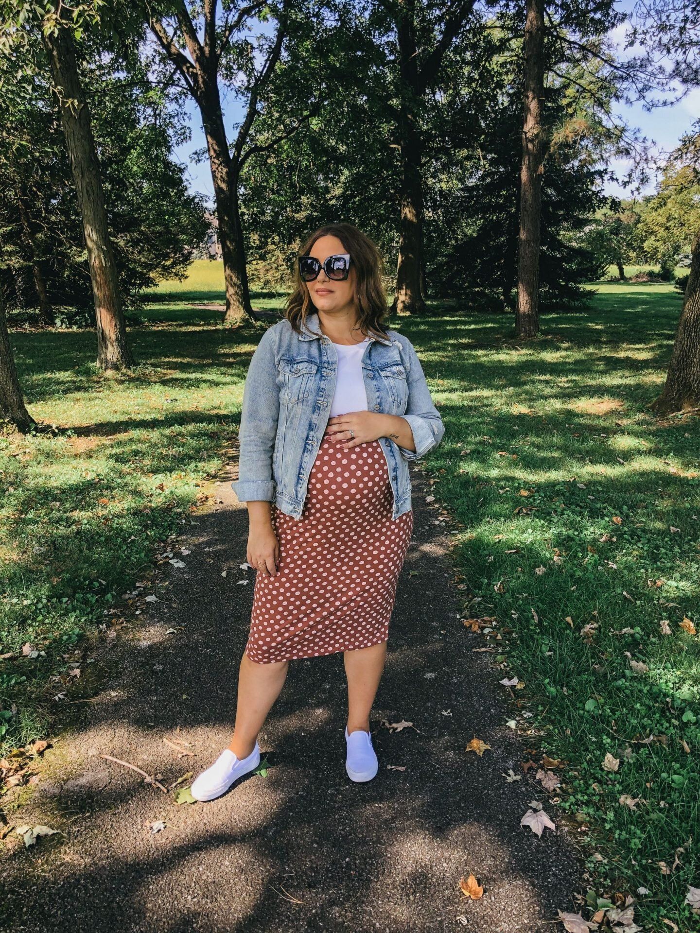 This first maternity style tip is probably one of my favorites—layering a tee over a fitted midi or maxi dress! The key to lengthening your petite frame? Bringing the hem of the tee above your baby bump, easiest done by tying it in the right place. Not only does this show off and emphasize your growing bump, but it tricks the eye into seeing a longer bottom half since your proportions are cut right below the bustline.