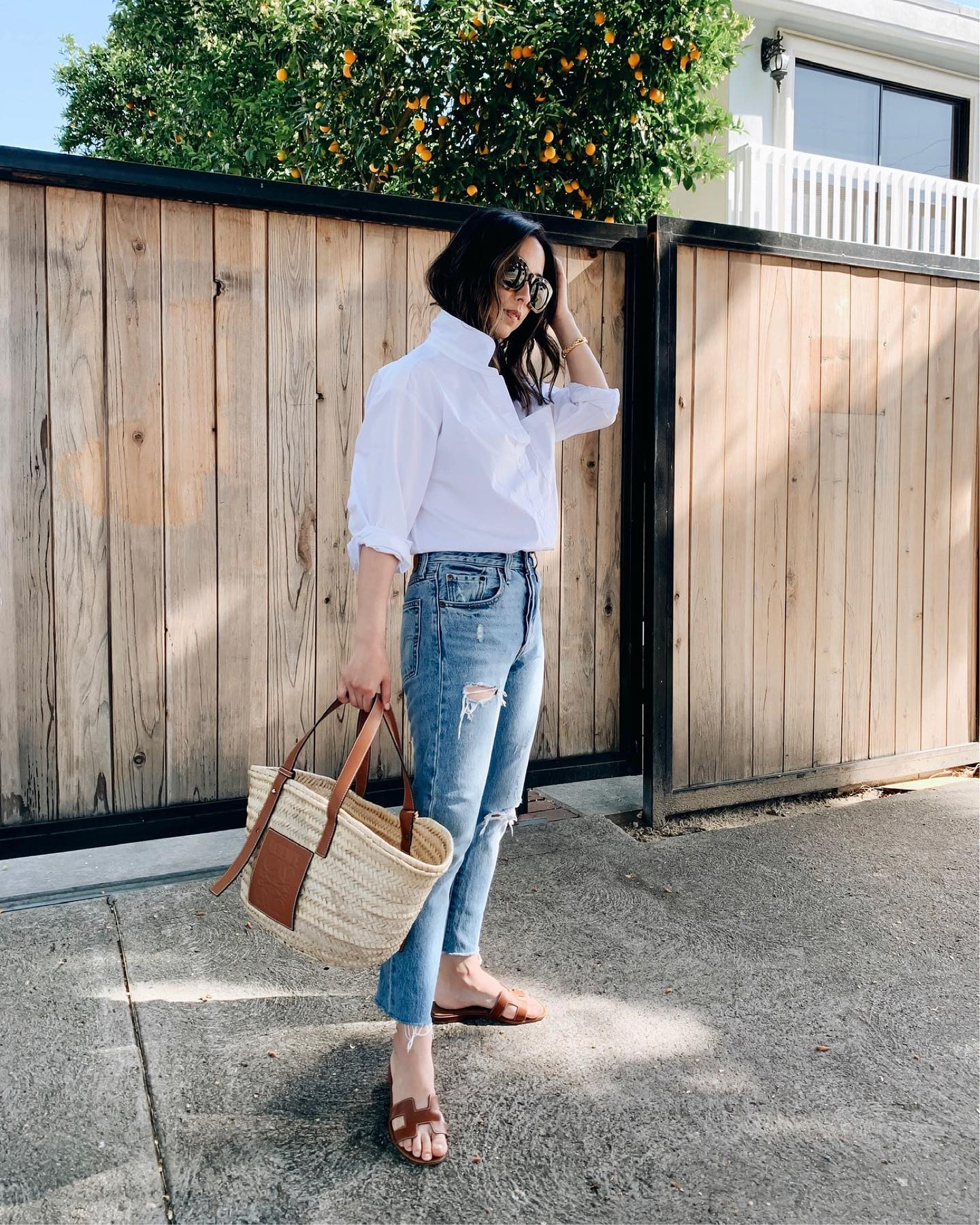 Add a pair of mules in a cognac brown color or if it’s still warm where you are go for a slide-on sandal instead. For a more stylish look, you can even go for a distressed pair of denim - think of some subtle distressing at the hems to still maintain that classy look.