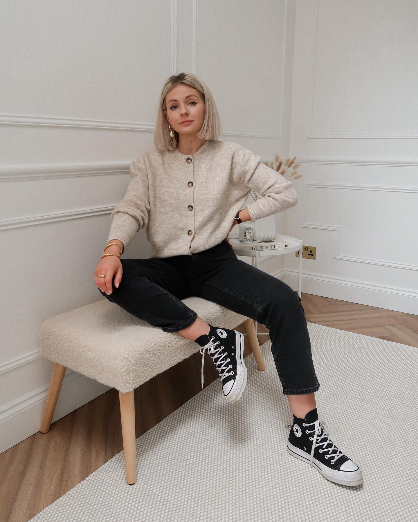Want to elongate your legs as a petite? Try a slightly cropped cardigan with high-rise pants to let your legs really shine. Then pair the ensemble with high-top sneakers or even with some chunky sneakers. It’s a low-key look that looks polished nonetheless and it’s super easy to personalize with your favorite layered rings and minimalist earrings.