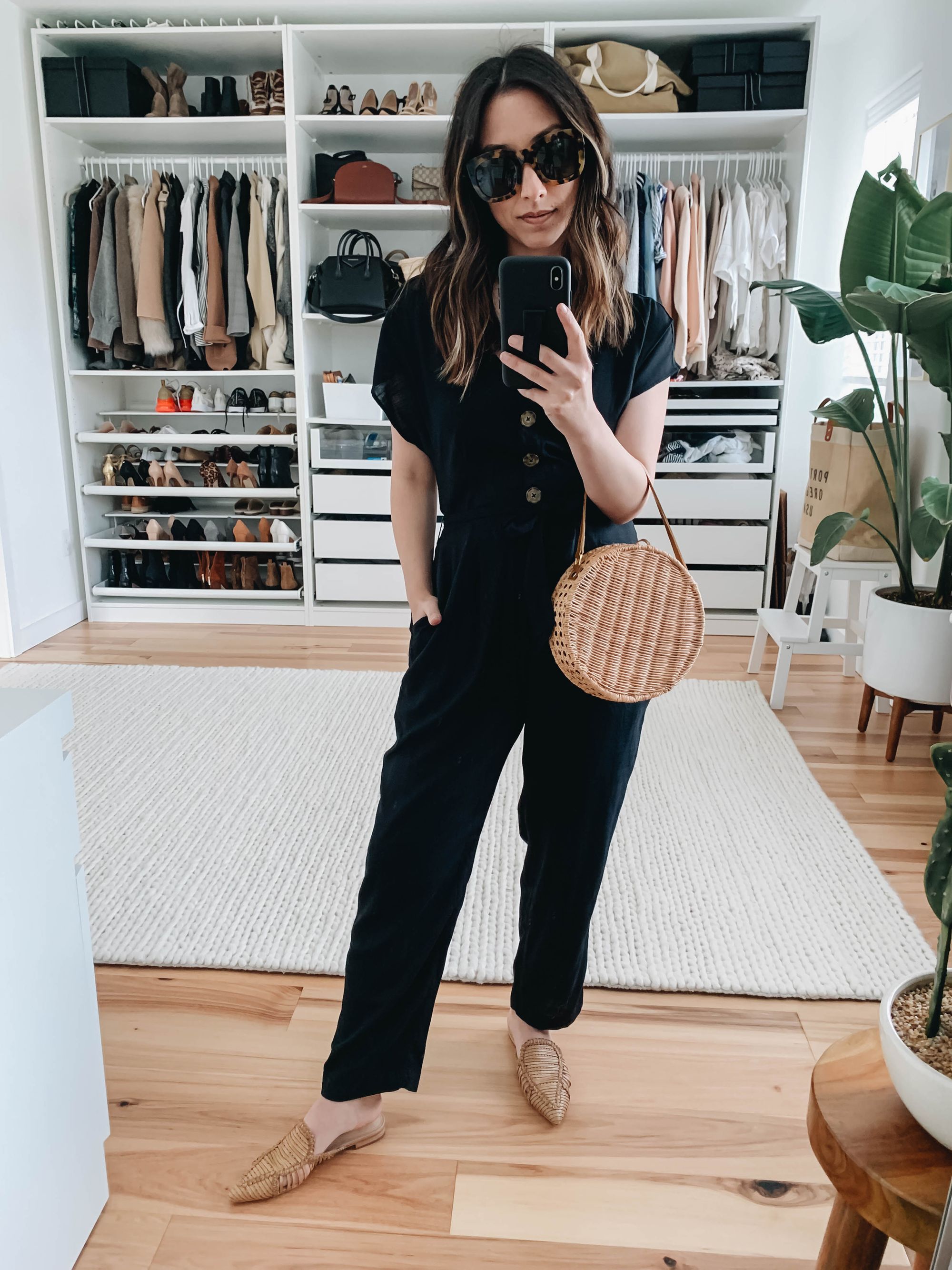 What I absolutely love about a classic black jumpsuit is that you can seamlessly transition into a night out with a quick switch of accessories! Happy hour or grabbing some drinks with friends is a perfect time to elevate your brunch/lunch look a bit. You can definitely stick to nicer flats, maybe even a fun printed pair, but instantly take the jumpsuit up a few notches with heels instead! Notice how Jean Wang of Extra Petite goes more casual styling hers with a larger casual tote and espadrilles, then skips jewelry and opts for aviator sunnies in the picture above.