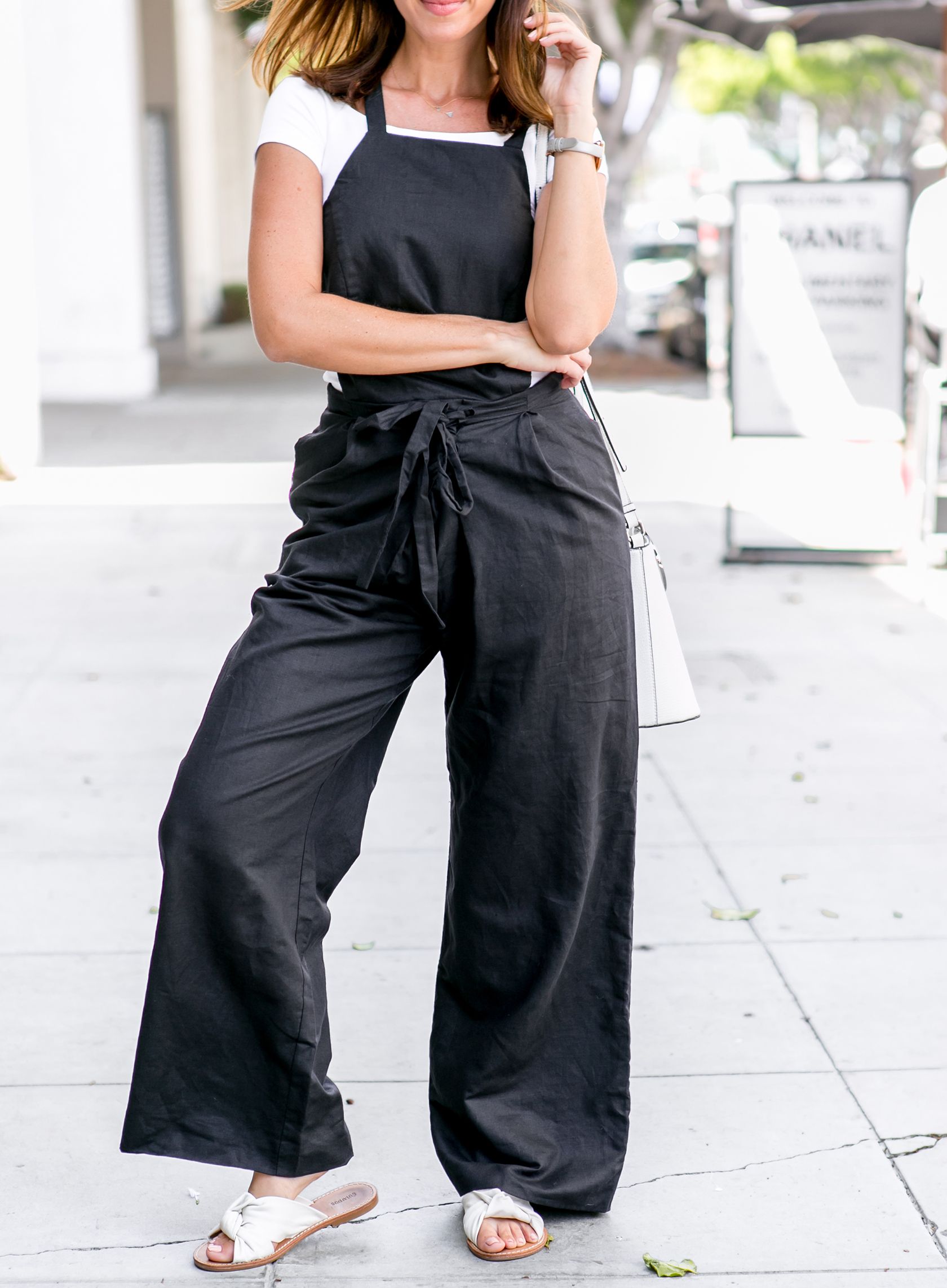 She then instantly elevates the jumpsuit in the next look below by adding a sleek black belt, swapping her tote for a smaller handbag, her espadrilles for d’Orsay heels, and switches her aviators for a classic black pair of sunglasses. The switch of accessories is so simple but still impactful. The key is to add some interest to your jumpsuit with fun layers, easy jewelry, and simple heels for a look that’s elevated but not so dressed up that you feel out of place.