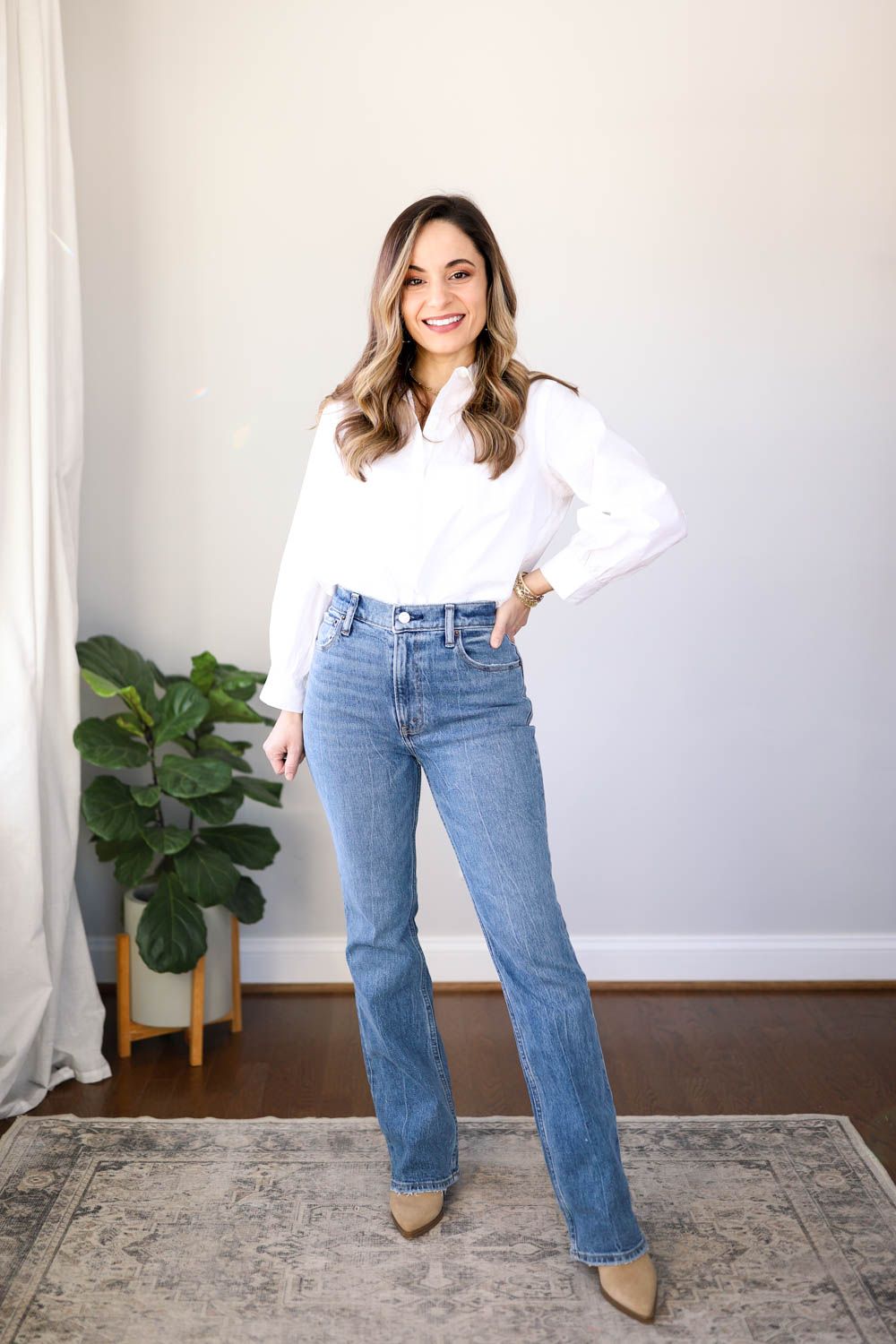 You can even try out a charming embroidered top or a romantic puff-sleeve blouse for some feminine flair. Try a classic French tuck with your favorite white blouse to create shape and balance out your petite proportions. Pair with light-wash straight-leg denim and loafers to complete the très chic look!