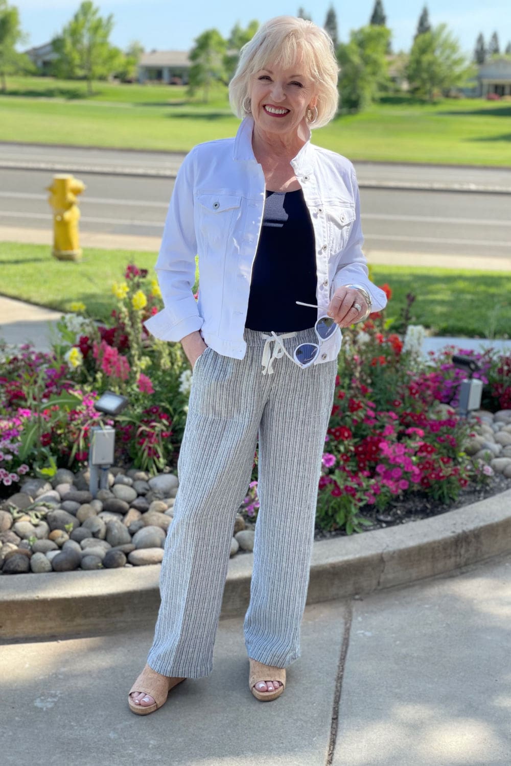 Ah, yes, the Golden Years. The time in our lives when we start thinking about retirement and starting a new, more relaxed chapter of our lives. Much like the 50s, we're probably pretty settled into a wardrobe we’re comfortable with at this stage in life. But there are still ways you can spice up your looks. My favorite way—accessories! Accessories are an easy way to take the same outfit and create several new looks out of it. Plus, they're great for traveling as they’re typically small and easy to pack. By now we know that creating length on the body as a petite is essential. We do this by adding the appearance of vertical lines.