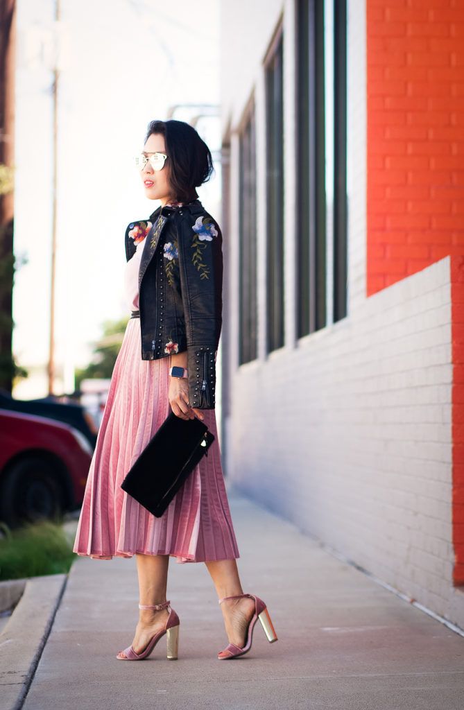 When I think of romantic styles, I usually picture ruffles, lace, chiffon, and not moto jackets. But believe me, this combination works! Instead of an edgy black leather or faux leather style, opt for a satin or velvet material that really softens the silhouette of the jacket. Embroidered florals and patterns aren't going anywhere and look flawless and gentle on a fitted jacket.
