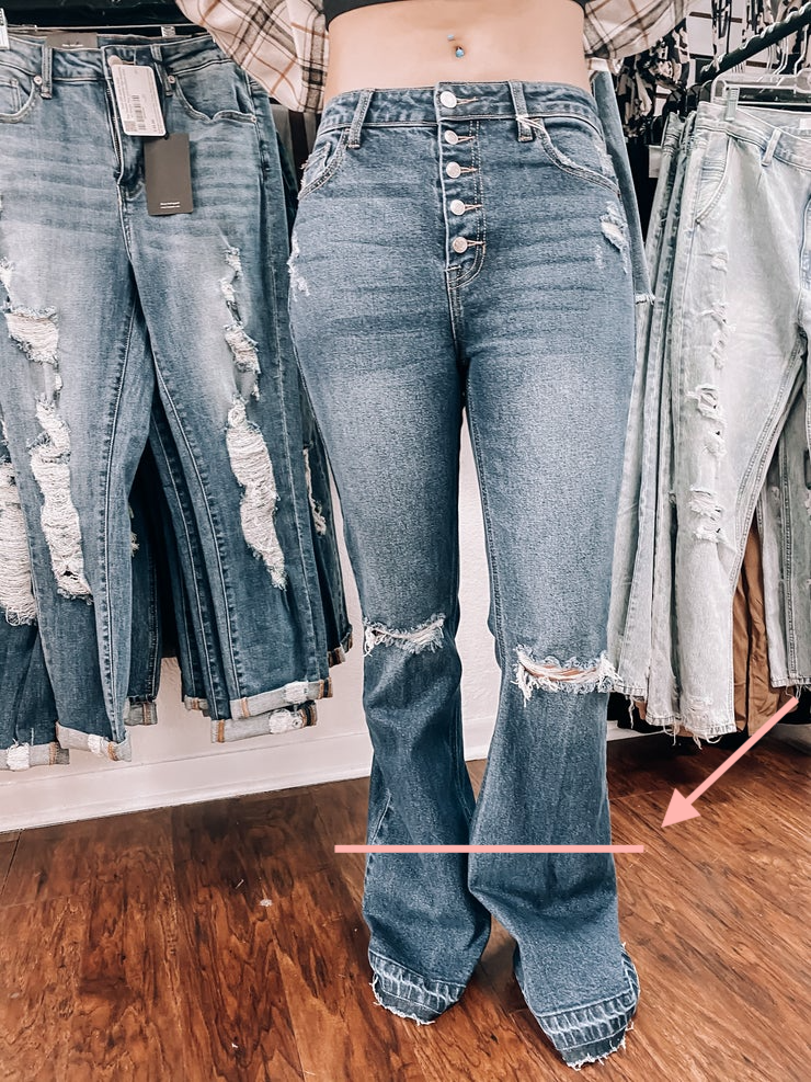 The style you see below may not work for you, but you can opt for a pair of jeans that don’t flare out too much, use too much fabric, and come in a shorter inseam. Depending on your height (4'8"-5'4"), we've found that the perfect inseams for petite flared jeans range from 26"-32".